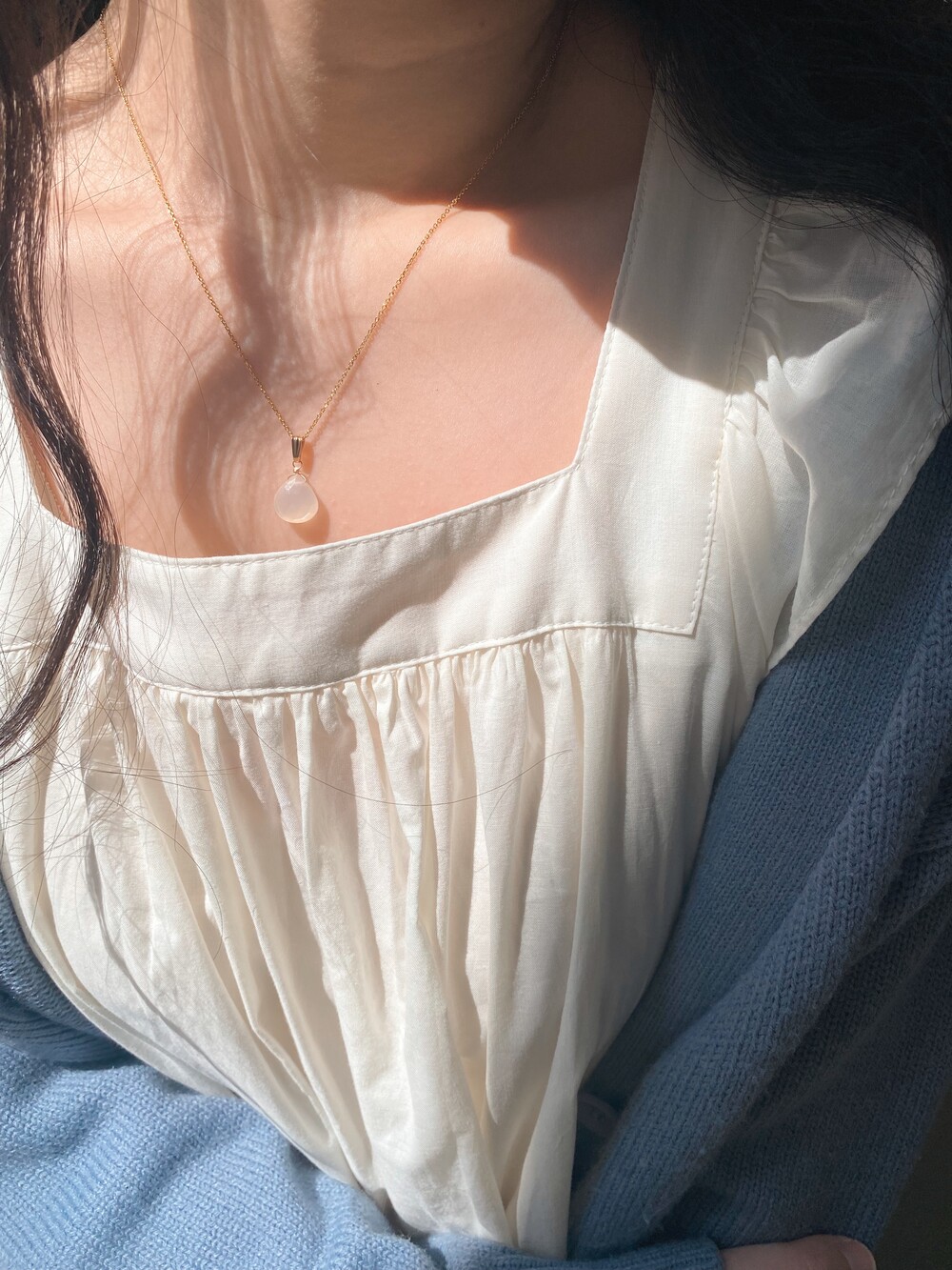 조절체인이 달려있어 쇄골라인에서 원하는 길이로 취향에 맞게 착용하실 수 있어요. (40~45cm)
